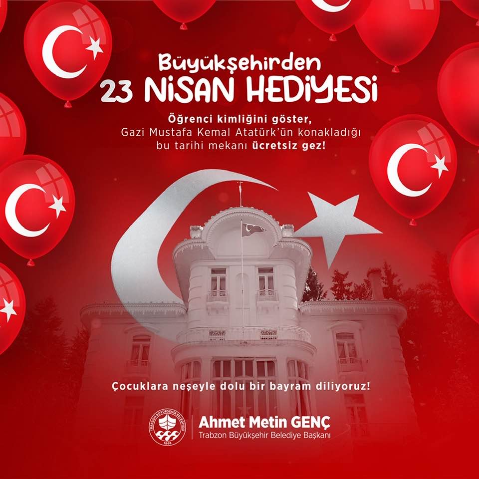 Trabzon Büyükşehir Belediyesi, kentin önemli simgelerinden biri olan ve Gazi Mustafa Kemal Atatürk’ün üç kez konakladığı Atatürk Köşkü'nün kapılarını 23 Nisan'da çocuklara ücretsiz açacak. Uygulamadan ilk ve ortaokul öğrencileri yararlanabilecek.