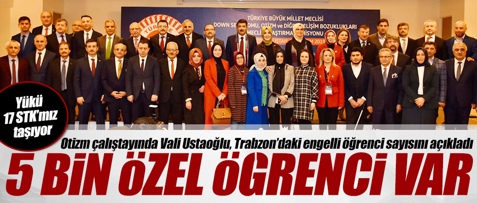 Trabzon'da Down Sendromu, Otizm ve Diğer Gelişim Bozukluklarının Yaygınlığının Tespiti ile ilgili bireylerin ve ailelerinin sorunlarının çözümü için alınması gereken tedbirlerin belirlenmesi amacıyla düzenlenen çalıştayda sorunlar değerlendirdildi. Trabzon’da Zorlu Otel’de düzenlenen çalıştaya Vali İsmail Ustaoğlu, Meclis Araştırma Komisyonu Başkanı Antalya Milletvekili Kemal Çelik, Komisyon Başkan Vekili Kocaeli Milletvekili Radiye Sezer Katırcıoğlu, AK Parti Trabzon Milletvekili Bahar Ayvazoğlu, Kayseri Milletvekili Hülya Nergis, Şanlıurfa Milletvekili Mehmet Ali Cevher, Trabzon Büyükşehir Belediye Başkanı Murat Zorluoğlu, Trabzon Ortahisar Belediye Başkanı Ahmet Metin Genç, AK Parti Trabzon İl Başkanı Haydar Revi, Trabzonspor Teknik Direktörü Ünal Karaman ile ilgili kurumların müdürleri katıldı.