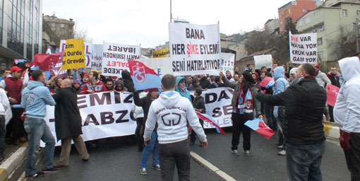 İSTANBUL’DA Gurbetçi Gençler’in organize ettiği protesto eylemi gerçekleştirildi. İstinye’de bulunan Türkiye Futbol Federasyonu binası önünde gerçekleştirilen eyleme yaklaşık 1000 kadar Trabzonspor taraftarı katıldı. Geçen yıl 1 Ocak’ta olduğu gibi İstinye Park Alışveriş Merkezi önünde toplanıp Federasyon binası önüne kadar yürüyen Gurbetçi Gençler, TFF önünde kendilerini bekleyen diğer taraftarlarla buluşarak sloganlar ve marşlar eşliğinde Federasyonu ve Başkan Yıldırım Demirören’i protesto ederek istifaya davet ettiler. Meşalelerin yakıldığı, şike konusuyla ilgili pankart ve dövizlerin açıldığı eylem, okunan basın bildirisinin ardından sona erdi.