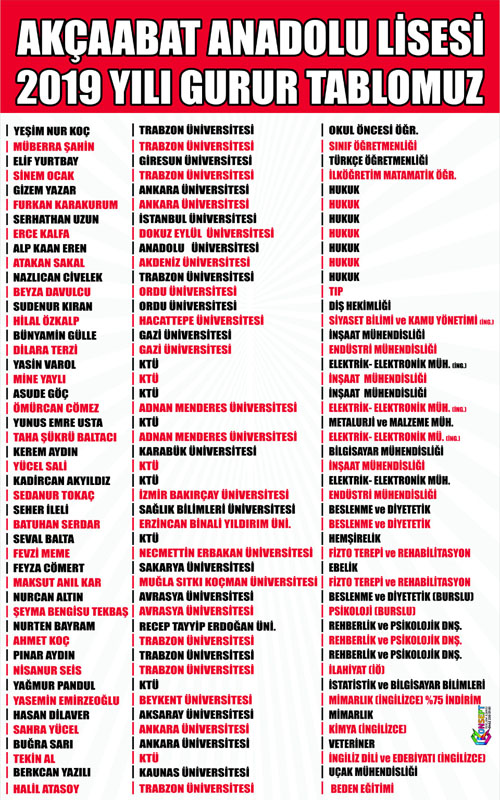 2019 Yılında %40 Üniversiteye yerleştirme başarısı göstererek Trabzon ve Türkiye ortalamalarının üzerine çıkmıştır.