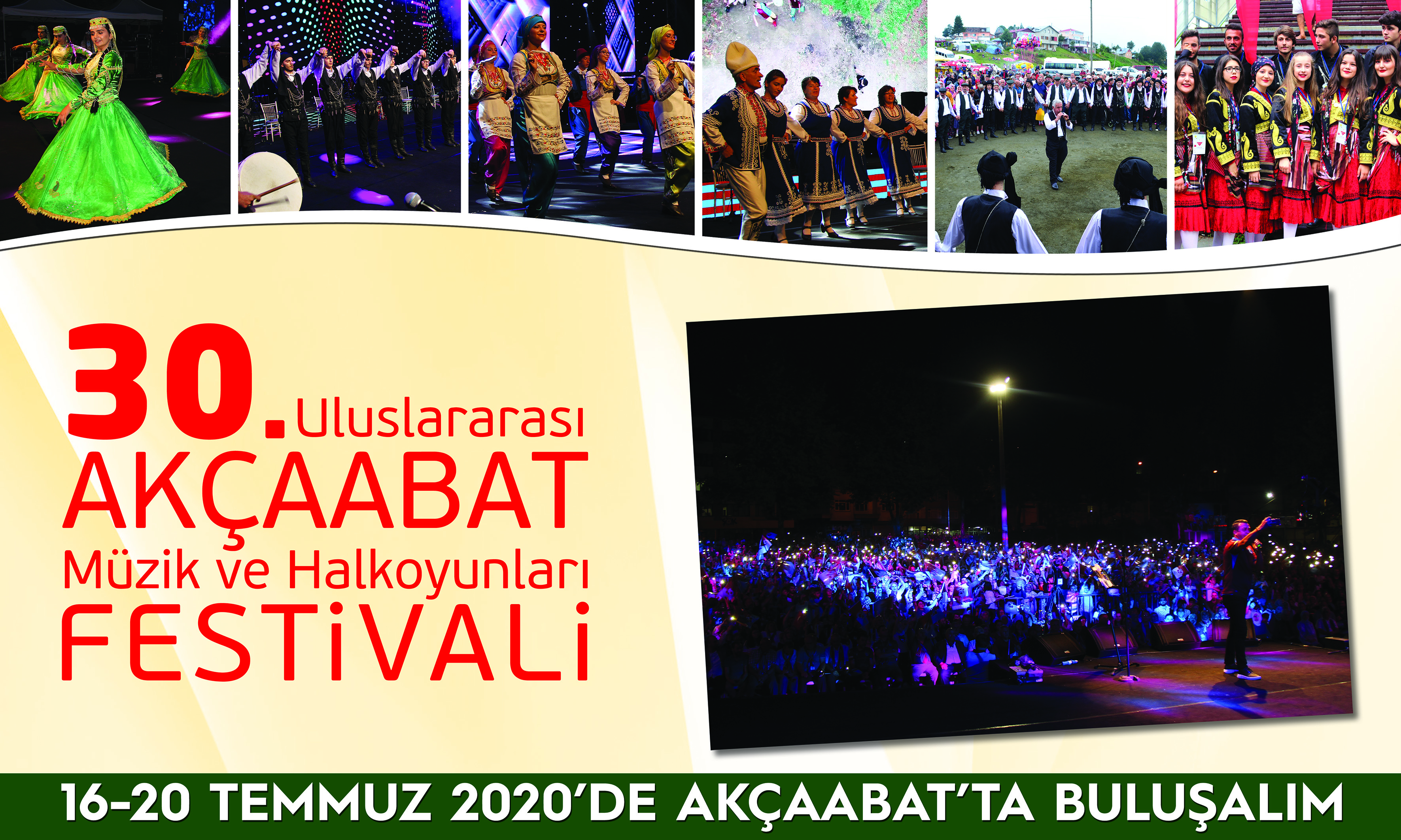 Akçaabat Belediyesi'nce her yıl geleneksel hale getirilen, uluslararası kimliğe sahip ve bölgemizin en büyük festivallerinden birisi olan Uluslararası Akçaabat Müzik ve Halkoyunları Festivalinin 30'uncusu 16 - 20 Temmuz 2020 tarihlerinde düzenlenecektir.
