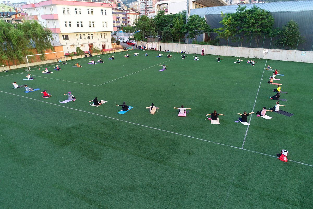 Akçaabat’ın temiz havasında, doğal güzellikleri içerisinde, enfes deniz manzarasında bir araya gelen kadınlar, sosyal mesafe kurallarına uygun şekilde spor hocalarının eşliğinde ısınma ve germe, kültür-fizik hareketleri yapıyor.