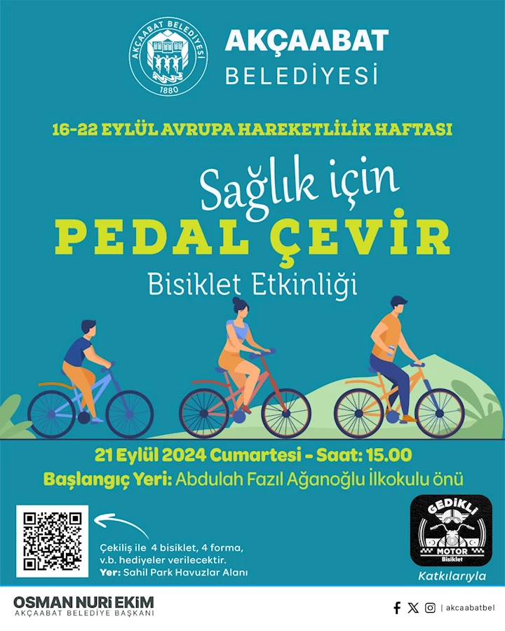 Sağlık İçin Pedal Çevir Bisiklet Etkinliği, 21 Eylül 2024 Cumartesi günü saat 15.00’te Abdullah Fazıl Ağanoğlu İlkokulu önünde gerçekleştirilecek.