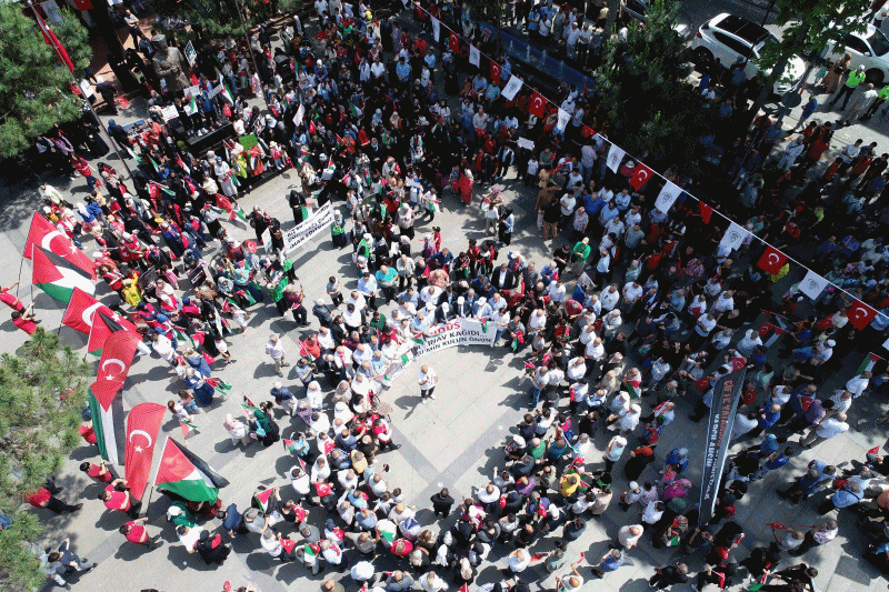 Cuma namazı çıkışında Ak Cami önünden başlayan yürüyüş, kaymakamlık binası etrafından geçerek Atatürk Parkı’na kadar devam etti. Atatürk Parkı’nda Filistin’e, Gazze’ye destek sloganları atıldı, basın bildirileri okundu.