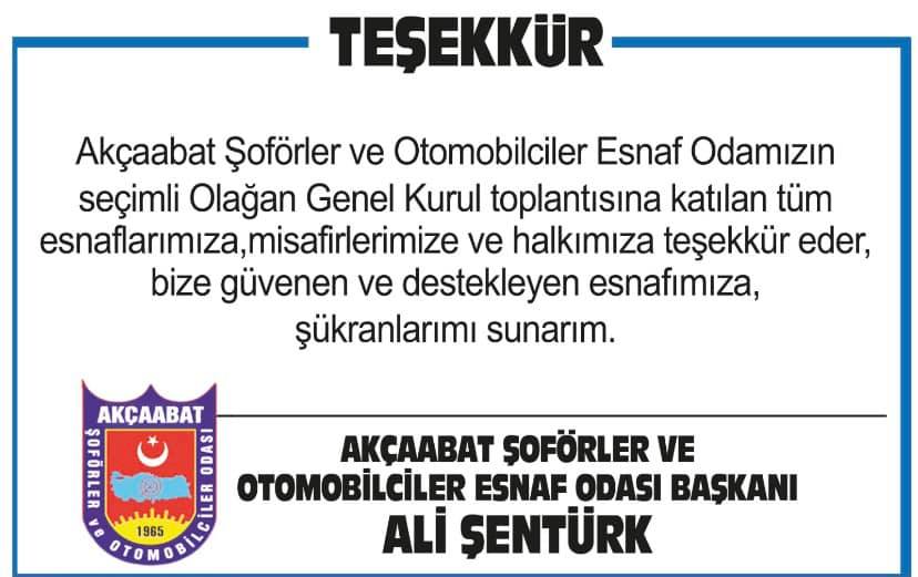 Bir ‎şunu diyen bir yazı '‎TEŞEKKÜR Akçaabat Şoförler ve Otomobilciler Esnaf Odamızın seçimli Olağan Genel Kurul toplantısına katılan tüm esnaflarımıza, misafirlerimi ve halkımıza teşekkür eder, bize güvenen ve destekleyen esnafımıza, şükranlarımı sunarım. AKÇAABAT KENH مببm DESO AKÇAABAT ŞOFÖRLER VE OTOMOBİLCİLER ESNAF ODASI BAŞKANI 1965 ALI ŞENTÜRK‎'‎ görseli olabilir