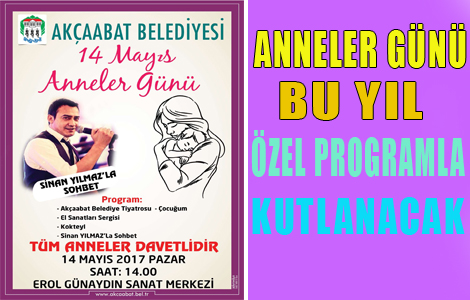 Akçaabat Belediyesi Kültür ve Sosyal İşler Müdürlüğünce bugünü annelere özel hissettirmek için Erol Günaydın Kültür ve Sanat Merkezi’nde bir program düzenleniyor. 14 Mayıs Pazar günü kutlanacak olan Anneler Günü için hazırlanan program kapsamında saat 14.00’da Erol Günaydın Kültür ve Sanat Merkezi’nde el sanatları sergisi açılacak, Akçaabat Belediyesi tiyatro ekibi tarafından “ Çocuğum” adlı oyun ücretsiz olarak sahnelenecek ve Sinan Yılmaz'la sohbet programı düzenlenecek.