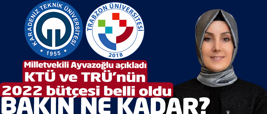 AK Parti Trabzon Milletvekili Bahar Ayvazoğlu, KTÜ ve Trabzon Üniversitesinin 2022 bütçlerinin bellli olduğunu açıkladı. Milletvekili Ayvazoğlu, “2022 yılı bütçemizden Karadeniz Teknik Üniversitemize 796 Milyon 564 Bin TL, Trabzon Üniversitemize 146 Milyon 327 Bin TL ayrılmıştır. Üniversitelerimizin ve Bakanlıklarımızın bütçelerinin milletimize hayırlı olmasını dilerim.” dedi.