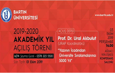 Bartın Üniversitesi ‘2019-2020 Akademik Yıl Açılış Programı’ 3 Ekim 2019 Perşembe günü saat: 14.00’da Ağdacı Yerleşkesi Konferans Salonu’nda gerçekleştirilecektir.