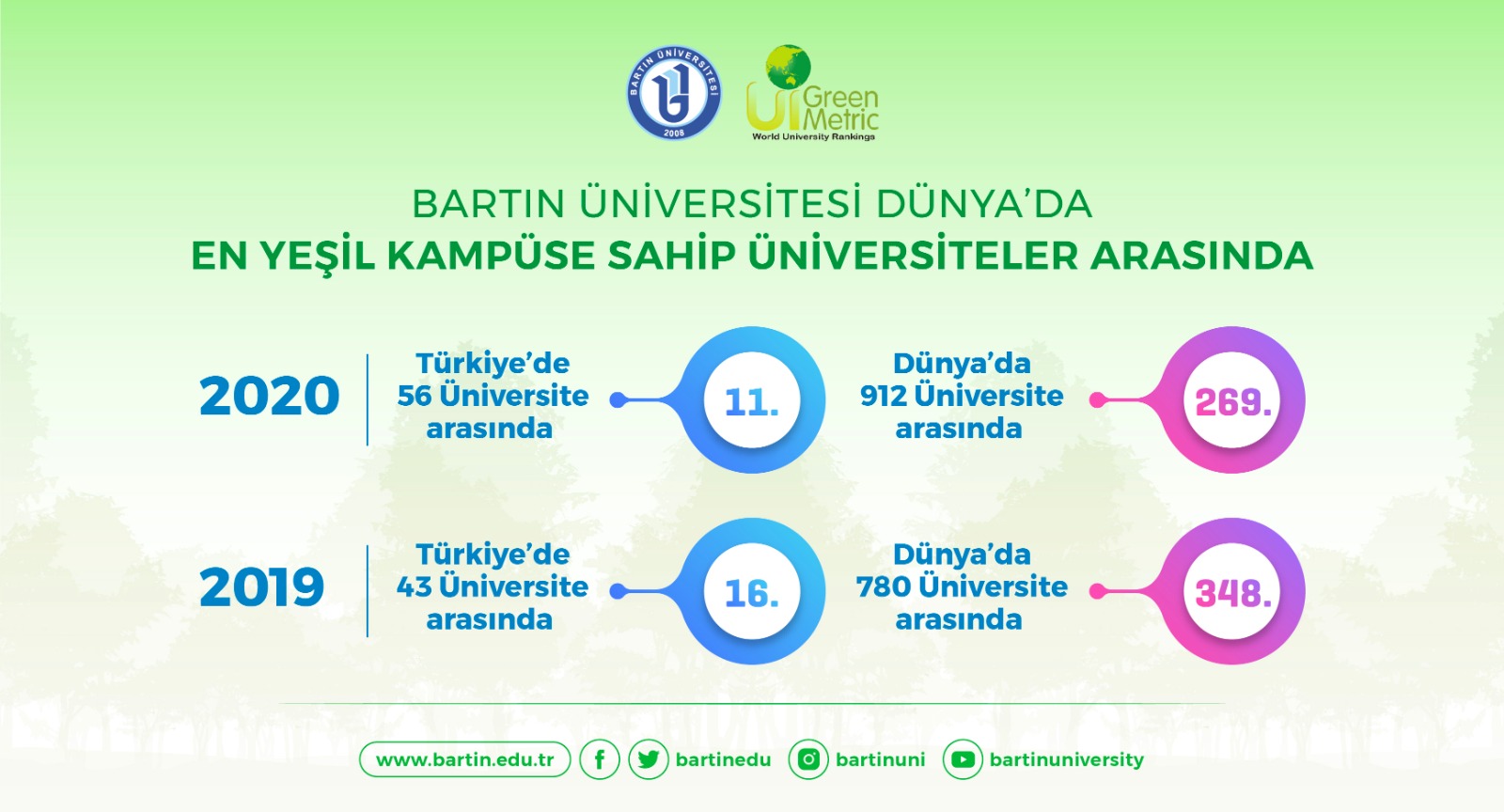 Sürdürülebilirlik ve çevre bilinci konusunda uluslararası bir platform olan Green Metric (Yeşil Ölçüm) Dünya Üniversiteler Sıralaması açıklandı. “Yeşil Üniversiteler 2020” sıralamasında Dünya genelinde 912 yükseköğretim kurumunun değerlendirildiği sıralamaya Türkiye’den 56 üniversite yer aldı. ‘Sürdürülebilir Yeşil Kampüs’ çalışmaları kapsamında birçok alanda önemli çalışmaların yapıldığı Bartın Üniversitesi, Türkiye’nin en iyi 11’inci yeşil kampüsü olurken Dünya’da ise 79 basamak birden yükselerek 269’uncu sıraya yerleşti. Bartın Üniversitesi, Green Metric’in geçtiğimiz yıl yaptığı “Yeşil Üniversiteler 2019” sıralamasında Türkiye’deki 43 üniversite arasından 16’ncı, Dünya’daki 780 üniversite arasından ise 348’inci sırada yer almıştı. Bartın Üniversitesi bir önceki yıla göre hem Dünya genelinde hem de Türkiye genelinde sıralamada yer verilen üniversite sayısı artmış olmasına rağmen sıralamadaki yerini yükseltmeyi başardı.