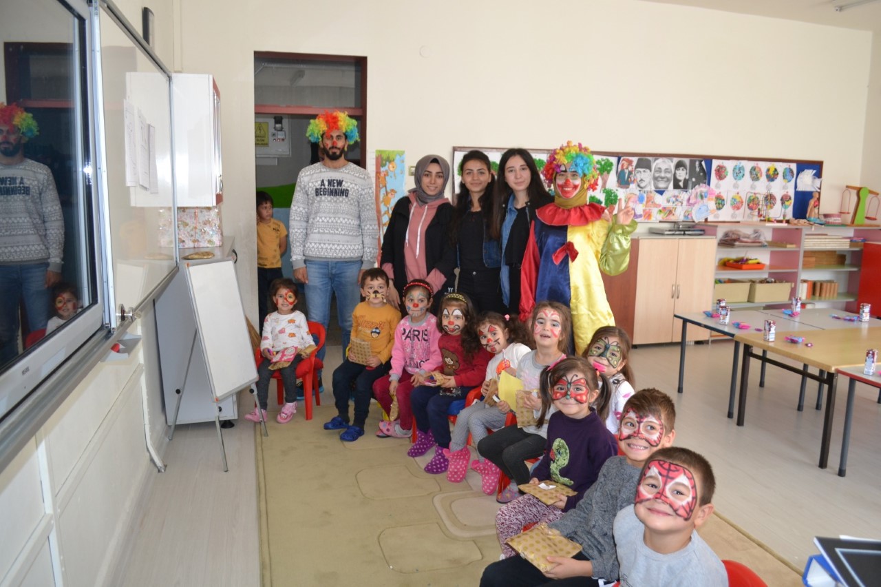Gün boyunca üniversite öğrencileriyle çeşitli oyunlar oynayıp, resim yapan ilkokul öğrencilerinin mutlulukları yüzlerinden okundu.