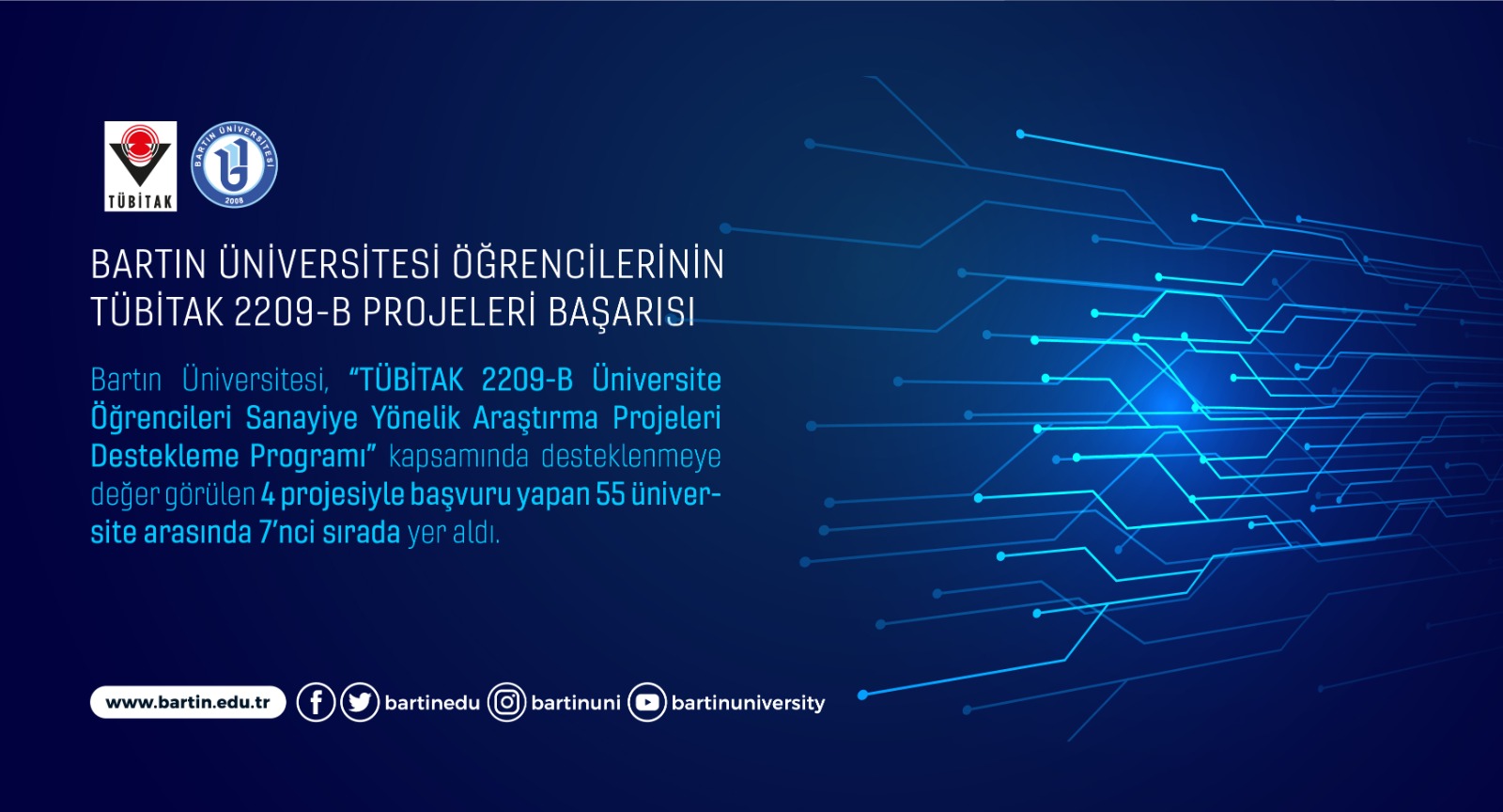 TÜBİTAK’ın teknolojik dönüşümün sağlanması ve değer zincirinde istenilen seviyelere ulaşılması için alanlarında başarılı öğrencileri desteklediği, üniversite-sanayi iş birliğini geliştirmek ve yeni teknolojilere öğrencilerin erişimini sağlamak amacıyla çağrıya çıktığı “TÜBİTAK 2209-B “Üniversite Öğrencileri Sanayiye Yönelik Araştırma Projeleri Destekleme Programı” başvuru sonuçları açıklandı. Yapılan değerlendirmenin ardından TÜBİTAK 2209-A Üniversite Öğrencileri Araştırma Projeleri Destek Program kapsamında 2019 yılı ikinci döneminde 32 projeyle Türkiye 5’incisi, 2020 yılı birinci döneminde 27 projeyle Türkiye 2’ncisi ve 2020 yılı ikinci döneminde ise 58 projeyle Türkiye 4’üncüsü olan Bartın Üniversitesinde sunulan 7 projeden 4’ü desteklenmeye değer bulundu. Bartın Üniversitesi başvuru yapan 55 üniversite arasında kabul olan proje sayısına göre 7’nci sırayı 4 üniversite ile birlikte paylaştı.