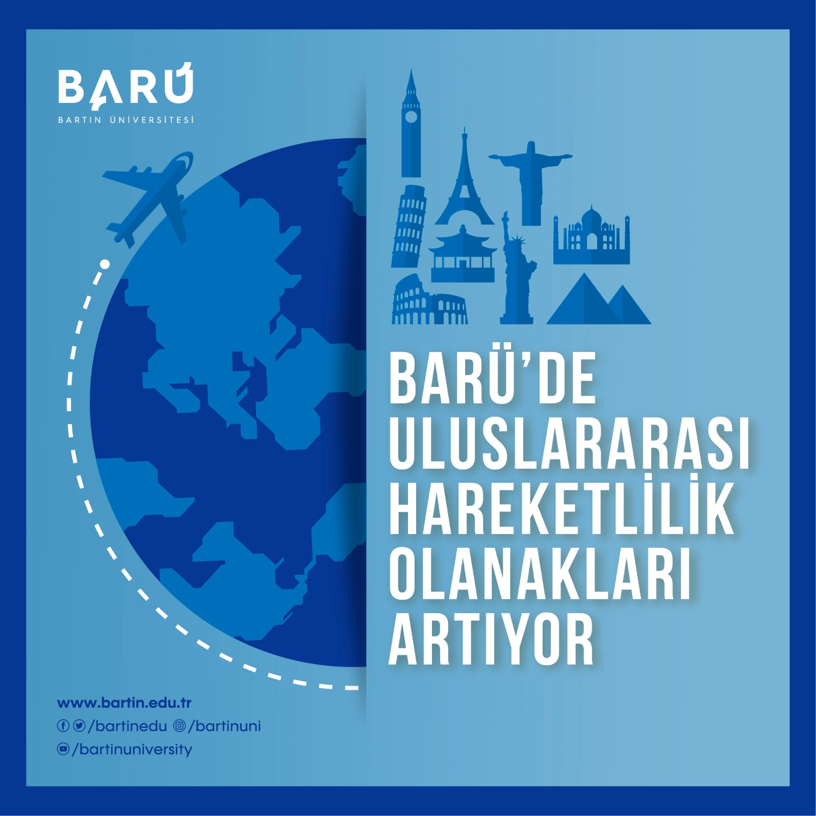 Bartın Üniversitesi (BARÜ) uluslararasılaşma hedefleri doğrultusunda yaptığı çalışmalarla uluslararası iş birliklerini ve değişim programlarından yararlanma kapasitesi artırıyor. Erasmus Programı kapsamında 25 ülkeden 75 üniversiteyle, Mevlana Programı kapsamında ise 10 ülkeden 17 üniversiteyle anlaşmaları bulunan BARÜ, değişim programlarıyla tüm bileşenlerine önemli fırsatlar sunuyor. BARÜ’de son olarak 2022 yılı çağrısı kapsamında Avrupa program ülkeleri dışında bulunan 6 farklı ülkeden ortak üniversiteler ile karşılıklı öğrenci ve personel değişimine olanak tanıyan Erasmus ICM Yükseköğretim Uluslararası Kredi Hareketliliği (KA171) başvurusu Türkiye Ulusal Ajans tarafından kabul edildi. Böylece Erasmus ve Mevlana programıyla hareketlilik yapılabilecek ülke sayısı 35’e, üniversite sayısı ise 92’ye yükseldi. Ayrıca BARÜ’nün dünyanın farklı bölgelerinden 57 farklı üniversite ile İkili İşbirliği (MoU) anlaşmaları da bulunuyor.
