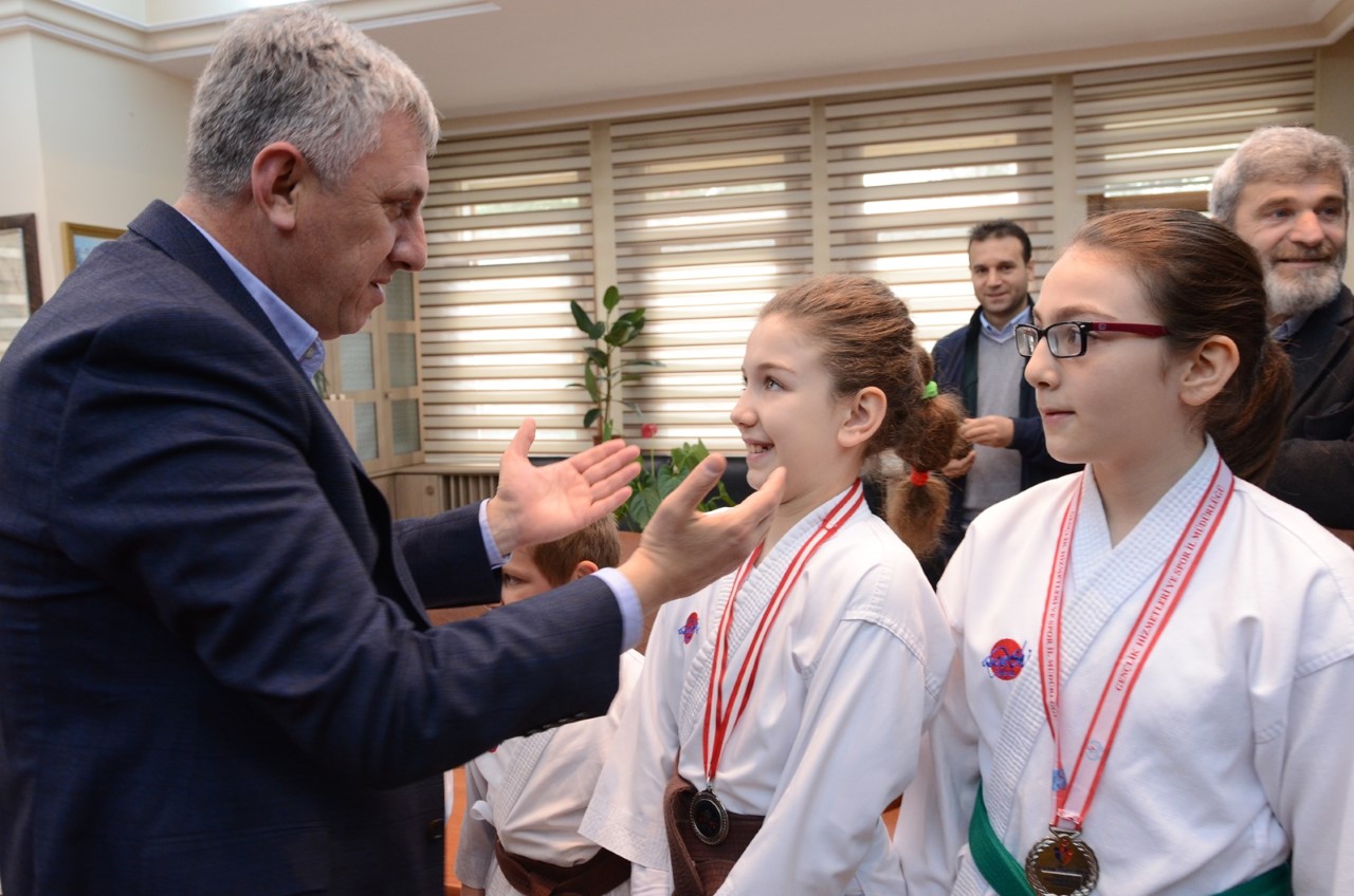Her iki yarışmada derece yapan sporcuları antrenörleri ve Karate Derneği yöneticileri ile birlikte makamında ağırlayan Başkan Sarıalioğlu, başarılı sporcuları altınla ödüllendirdi.