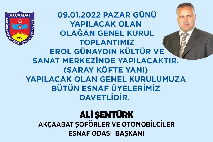 Başkan Şentürk Yaptığı Açıklamada 09-01-2022 Pazar Günü Yapılacak Olan Genel Kurul Toplantımıza Bütün Şoför Esnafımızı Davet Ediyorum Dedi.