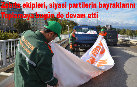Ortahisar İlçe Seçim Kurulu’nun aldığı karar çerçevesinde ilçe genelinde izinsiz olarak asıldığı tespit edilen siyasi parti bayrakları Trabzon Büyükşehir Belediyesi zabıta ekipleri tarafından toplanıyor.