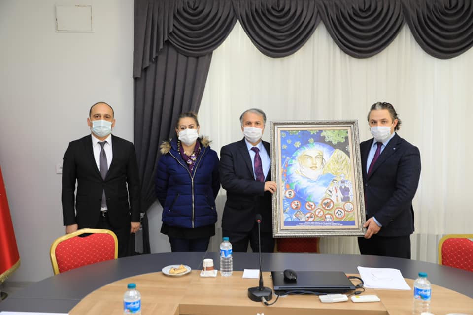 Covit - 19 sürecinde "Sağlık Çalışanlarına Vefa" konulu resim yarışmasında Trabzon il 1.si Akçaabat Mevlüt Selami Yardım Ortaokulu 8. Sınıf öğrencisi Züleykha SOLTANİ’nin eserini, İlçe Kaymakamımız Sayın Ramazan KURTYEMEZ, İlçe Sağlık Müdürümüz Dr.Alper KALKIŞIM’a takdim etti.