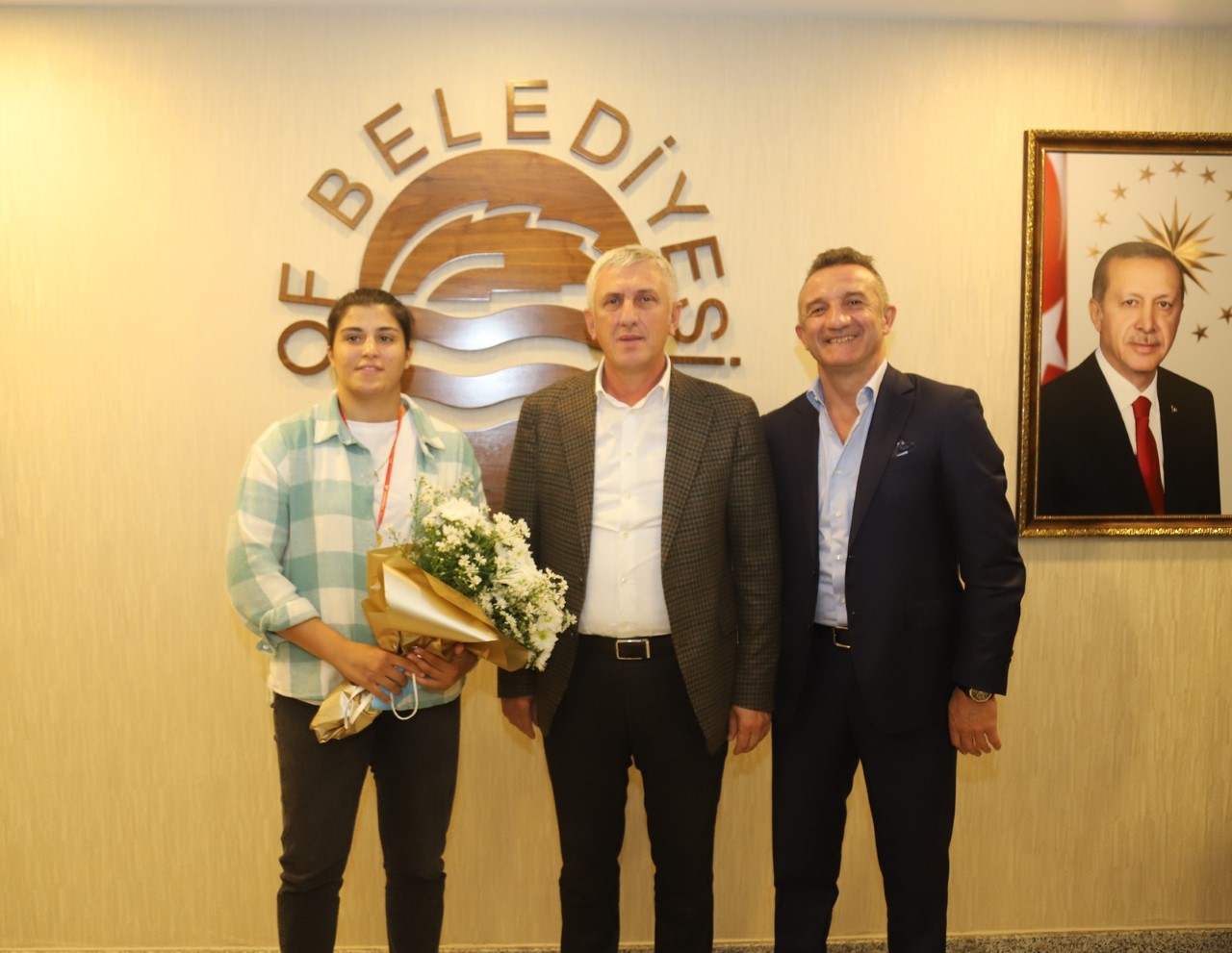 Başkanlık makamında Busenaz Sürmeneli ile sohbet eden Başkan Sarıalioğlu, Busenaz Sürmeneli'ye reşat altını takdiminde bulundu. Of Belediye Meclis Üyesi Yasemin Hacıefendioğlu ise Sürmeneli'ye çiçek takdiminde bulundu.