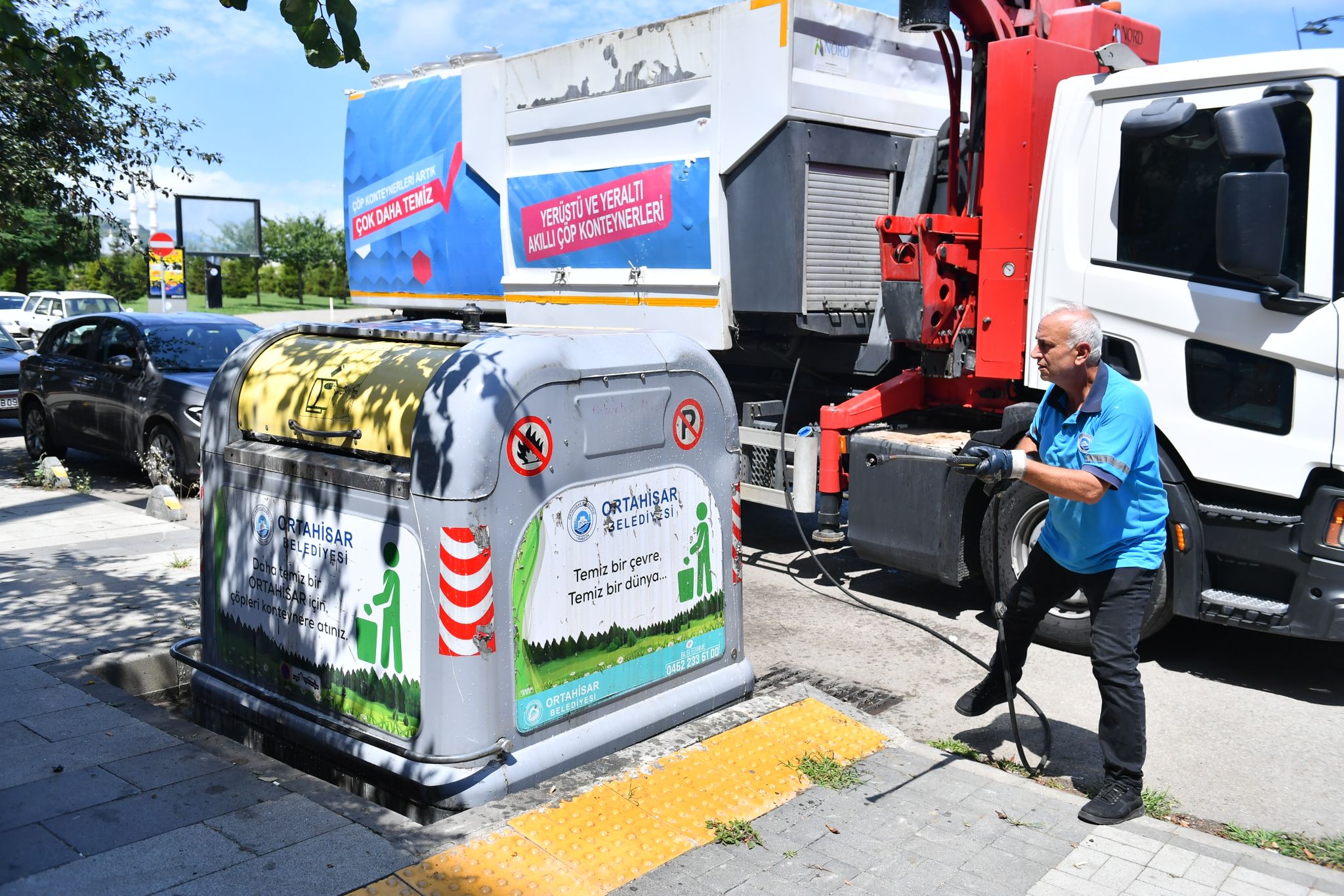 Ortahisar ilçesinde yaz aylarında günlük çöp sarfiyatının 350-360 tona ulaştığını ifade eden Başkan Genç, “Çok sıcak bir yaz mevsimi geçiriyoruz. Dolayısıyla çöp konteynerlerinin temizliği ve bakımı çok önemli hale geliyor. Hem hastalıklara sebebiyet vermemek, hem de çevre temizliğini sağlamak adına yeraltı ve yer üstü bütün konteynerlerimizin temizliğini daha sık aralıklarla yapıyoruz. İlçemizdeki artan nüfus yoğunluğu da düşünüldüğünde çevre sağlığını korumak, çöplerden kaynaklı hastalıkları önlemek için özellikle yaz aylarında yıkama ve temizlik faaliyetlerine ağırlık veriyoruz. Yaz aylarında artan nüfus yoğunluğuna bağlı olarak ilçemizde üretilen çöp miktarı günlük 350-360 tona kadar çıkıyor. Bundan dolayı konteynerlerin temizliği ve hijyeni çok mühim bir konu… Konteynerlerin içi ve dışı, bulunduğu alan yıkanarak temizleniyor. Vatandaşlarımız gönül rahatlığıyla konteynerleri kullanabilirler. Ortahisar Belediyesi olarak ilçemizin temizliğini ve hijyenini düşünmek zorundayız. Turizm yoğunluğunun arttığı bu zaman diliminde yerel yönetimler kentlerinin temizliğinden birinci derecede sorumludur. Diğer yandan vatandaşlarımızın en temiz çevrede yaşama hakkını temin etmek belediye olarak bizim görev ve sorumluluğumuzdadır.” diye konuştu.