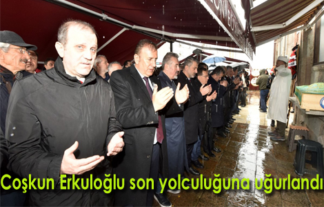 Coşkun Erkuloğlu için İskenderpaşa Camisi’nde öğle namazının ardından kılınan cenaze namazına CHP Trabzon Milletvekili Ahmet Kaya, KTÜ Rektörü Prof. Dr. Hamdullah Çuvalcı, Ortahisar Belediye Başkanı Ahmet Metin Genç, AK Parti İl Başkanı Sezgin Mumcu, TTSO Meclis Başkanı M. Şadan Eren, Erkuloğlu’nun damadı TTSO Başkanı Erkut Çelebi, TTSO eski yönetim kurulu başkanları, eski ve yeni yönetim kurulu ve meclis üyeleri, iş dünyası temsilcileri ile vatandaşlar katıldı. Coşkun Erkuloğlu’nun cenazesi namazın ardından Sülüklü Mezarlığındaki aile kabristanlığında toprağa verildi.