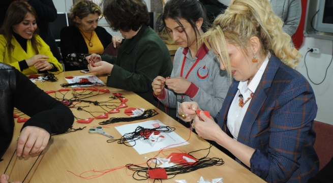 İlimizde Valimiz Yücel Yavuz’un eşi Şengül Yavuz himayelerinde yürütülen Gönül Elçileri Projesi kapsamında Trabzon’daki tüm gönülleler “Al Bayraklı Duamız” adlı projeye destek vermek için Türk Bayraklı Cevşen dikimine tüm hızıyla devam ediyor. Atatürk Mesleki ve Teknik Anadolu Lisesi öğrencilerinin hazırladığı ve gönül elçilerinin desteklediği “Al Bayraklı Duamız” projesi çerçevesinde gönül elçileri, şehit ailelerimiz, Sivil Toplum Kuruluşları ve Halk eğitim Müdürlüğü hocaları ve kursiyerleri tarafından büyük bir titizlikle hazırlanıyor. Şengül Yavuz Bugün burada öğrencilerimizin hazırlamış olduğu projeye destek vermek amacıyla ikinci kez bir araya geldik. Başta Halk Eğitim Müdürümüz Orhan Genç, kursiyerleri, hocalarının destekleri ve emekleri için kendilerine teşekkür ediyorum. Trabzon Hasırının da kullanıldığı 2 bine yakın Türk Bayraklı Cevşenler inşallah bu projeye destek verenlerle birlikte özenle hazırlayıp sınırımızda ve Afrin’de görev yapan Mehmetçiklerimize en kısa ulaştıracağız dedi” Böyle bir projenin içerisinde duymuş oldukları mutluluğu ve gururu dile getiren şehit ailelerimiz de hiçbir zaman kendilerini yalnız bırakmayan başta valimiz ve eşleri olmak üzere bu projede emeği geçen herkese teşekkürlerini sundular.