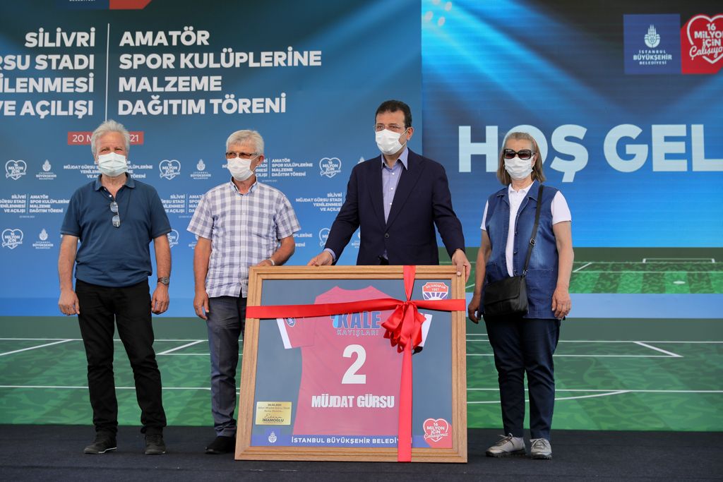 Konuşmaların ardından merhum Gürsu’nun aile fertleri de sahneye davet edildi. İmamoğlu, Gürsu ailesine, özel basım, arkasında “Müjdat Gürsu” yazılı, 2 numaralı Silivrispor forması hediye etti. Kurdele kesiminin ardından sahaya inen İmamoğlu ve beraberindeki heyet, içlerinde amatör spor kulüplerinin ihtiyaçlarına yönelik malzemelerin bulunduğu kolilerin dağıtımlarını gerçekleştirdi.