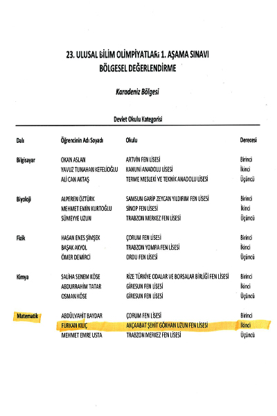 Buna göre Akçaabat Şehit Gökhan Uzun Fen Lisesi, TÜBİTAK tarafından düzenlenen 23. Ulusal Bilim Olimpiyatları’nda büyük başarı gösterdi ve öğrencisi Furkan Kılıç, bölge ikincisi oldu.
