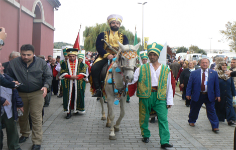 Temsili Fatih Sultan Mehmet figürü ve askerleri de kortejin önü sıra salona girdi.