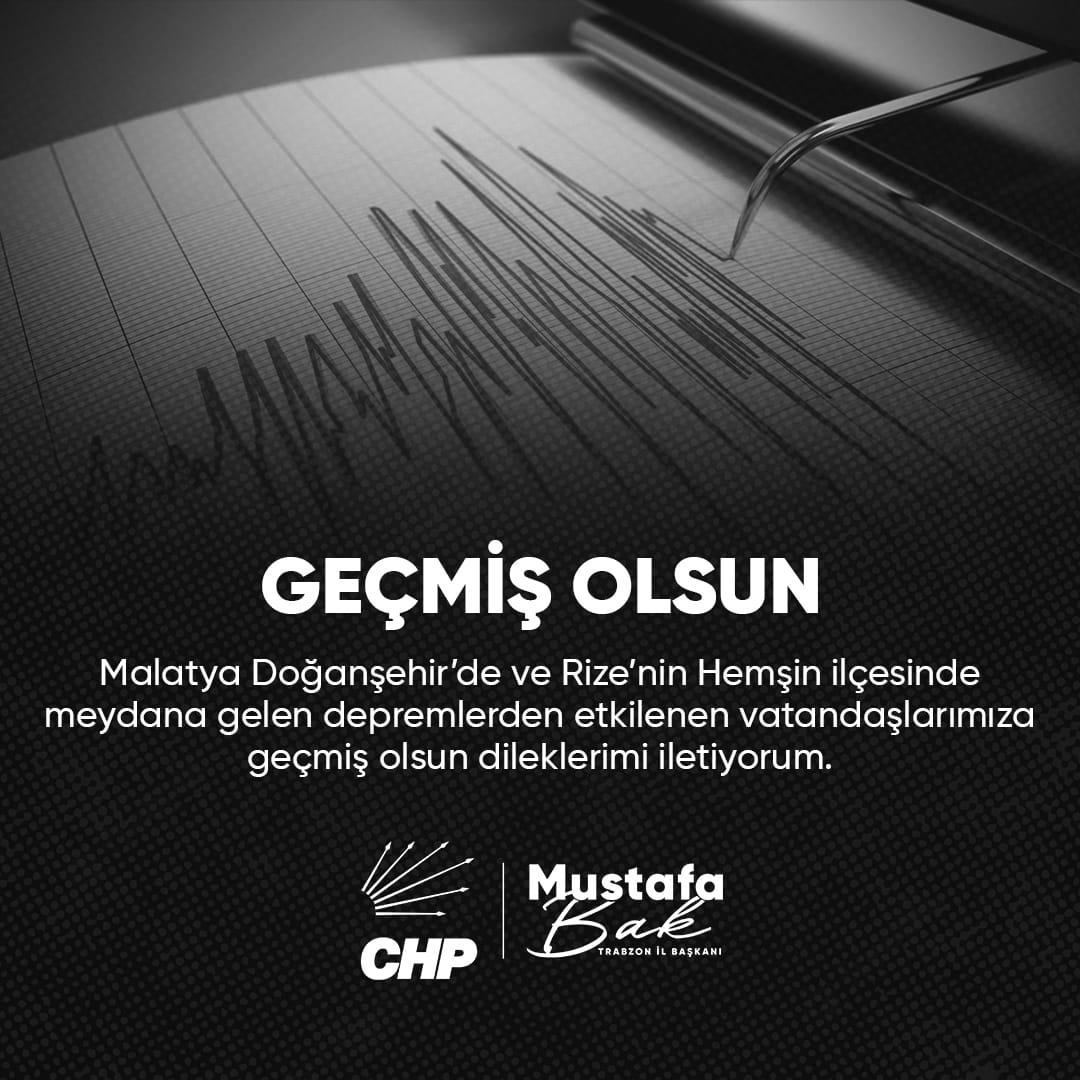 Bugün Saatler 12:02 de Malatya Doğanşehir ve Rize'nin Hemşin İlçesinde Gerçekleşen Depremle İlgili Cumhuriyet Halk Partisi Trabzon İl Başkanı Mustafa Bak Geçmiş Olsun Mesajı Yayınladı.