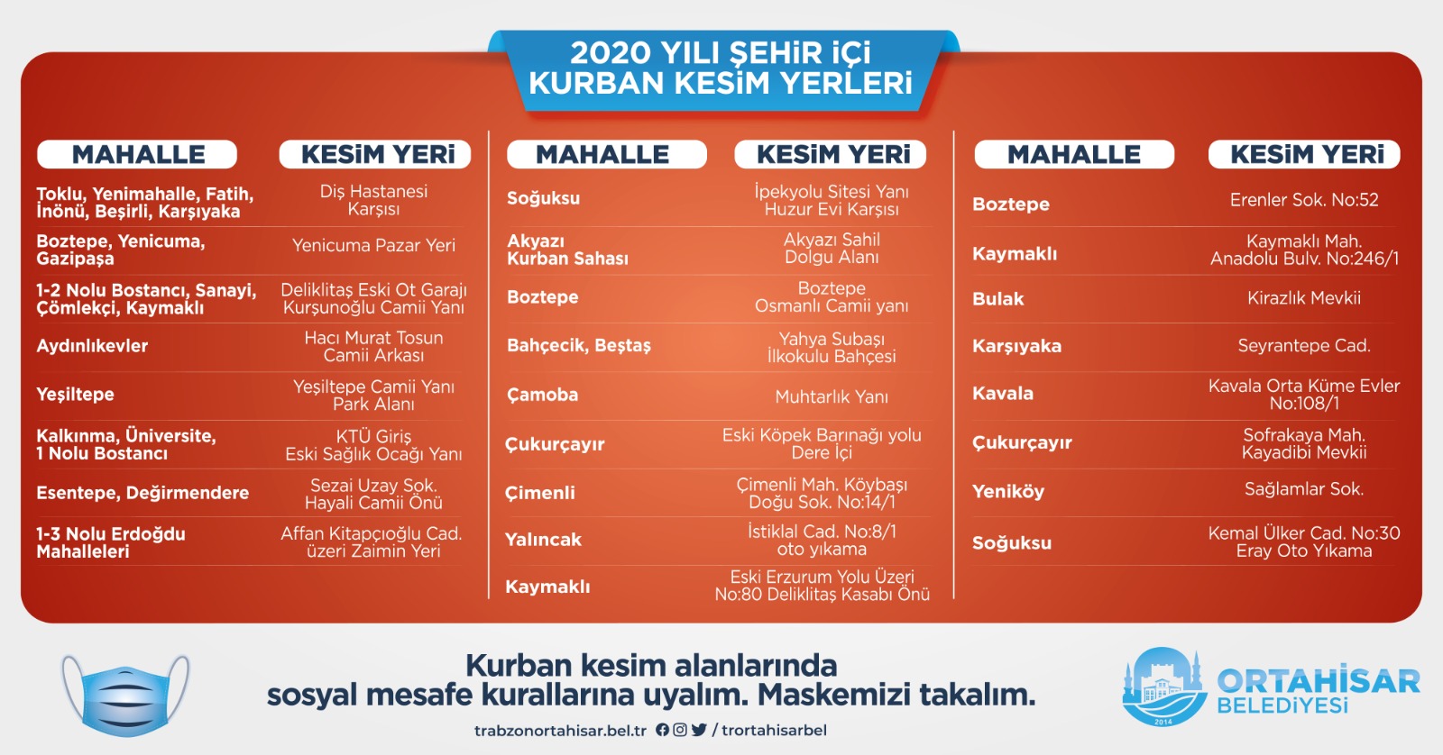 Ortahisar İlçesi için kurban kesim yerleri şöyle, Yenimahalle Diş Hastanesi, Yenicuma Pazar yeri, Deliklitaş Eski Oto Garajı Kurşunoğlu Camii yanı, Aydınlıkevler Hacı Murat Tosun Camii arkası, Yeşiltepe Camii Park alanı, KTÜ girişi eski sağlık ocağı yanı, Esentepe Sezai Uzay Sokak Hayali Cami Yanı, Affan Kitapçıoğlu Caddesi üzeri Zaimin yeri, İpekyolu Sitesi yanı Huzur Evi karşısı, Akyazı sahil dolgu alanı, Boztepe Osmanlı Camii yanı, Yahya Subaşı İlkokulu bahçesi, Çamoba Muhtarlık yanı, Çukurçayır eski köpek barınağı yolu dere içi, Çimenli Mahallesi Köybaşı Doğu Sokak No:14/1, Yalıncak İstiklal Caddesi No:8/1oto yıkama, Kaymaklı eski Erzurum yolu üzeri No:80 Deliklitaş kasap önü, Boztepe Erenler Sokak No.:52, Kaymaklı Mahallesi Anadolu Bulvarı No:246/1, Bulak Kirazlı Mevkii, Karşıyaka Seyrantepe, Kavala orta küme evleri No.:108/1, Çukurçayır Sofrakaya Mahallesi Kayadibi Mevkii, Yeniköy Sağlamlar Sokak, Soğuksu Kemal Ülker Caddesi No.:30 Eray Oto yıkama