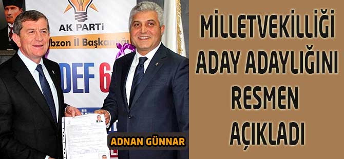 AK Parti Trabzon’da büyük başarılara imza atan AK Parti Trabzon Eski İl Başkanı Dr. Adnan Günnar, milletvekili aday adaylığı başvurunda bulundu. İl binasında müracaat formunu İl Başkanı Haydar Revi’ye teslim etti.
