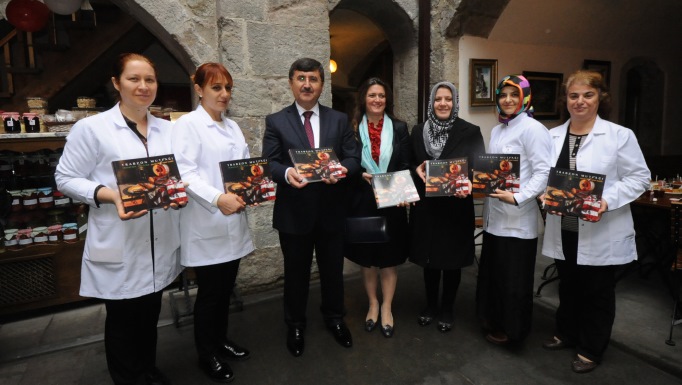 Vali Abdi Celil Öz eşi ile birlikte Alacahan’da yöresel yemek yapan kadınlarla birlikte kitabı tanıtırken özellikle Trabzon mutfağının orijinal yemeklerinin yapım tarifleri için özel bir araştırma yapıldıktan sonra kaleme alındığını belirtti.