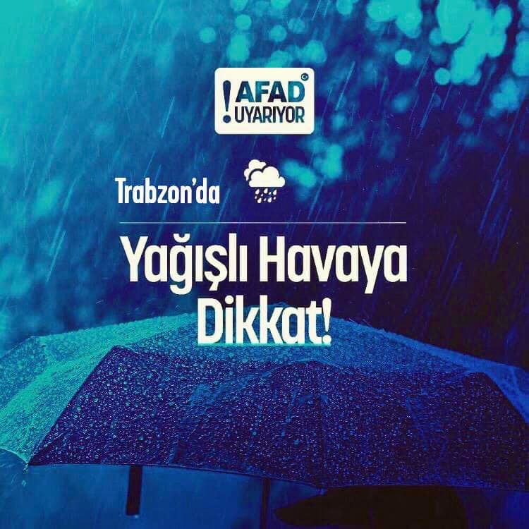 Meteoroloji’den alınan bilgilere göre; 02.06.2021 (Çarsamba) sabah saatlerinden itibaren Doğu Karadeniz'de görülecek olan sağanak ve gök gürültülü sağanak yağışların, Trabzon'un batı ve doğu ilçeleri ve Rize ili ile Artvin'in kıyı kesimlerinde yerel kuvvetli (30-60 kg/m2) olması beklendiğinden ani sel, su baskını, yıldırım, yağış anında kuvvetli rüzgar ve ulaşımda aksamlar gibi olumsuzluklara karşı dikkatli ve tedbirli olunması gerekmektedir.