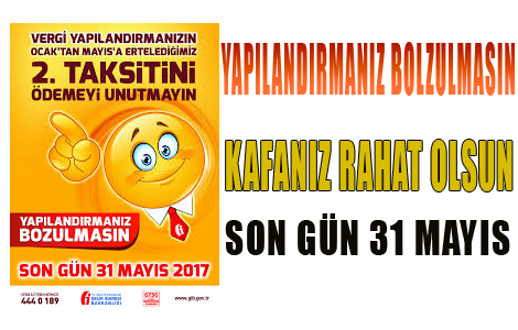 Kanun hükümlerine göre borçlarını yapılandıran mükelleflerimizin, peşin veya ilk iki taksit ödemelerini her hal ve takdirde 31 Mayıs 2017 tarihi bitimine kadar yapmaları gerekmektedir.