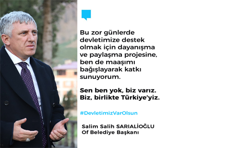 Ülkemizde koronavirüsle mücadelenin başladığı ilk günden buyana ekipleri ile sahada var gücüyle çalışmalarını sürdüren Of Belediye Başkanı Salim Salih Sarıalioğlu, aldığı iki kararla örnek olacak bir harekete imza attı. Başkan Sarıalioğlu, başkanlık maaşını bağışlayarak koronavirüs salgını nedeniyle sahada çalışan belediye personeline maaş ikramiyesi verme kararı aldı. Sarıalioğlu yaptığı açıklamada, “Bu zor günlerde devletimize destek olmak için dayanışma ve paylaşma projesine, ben de maaşımı bağışlayarak katkı sunuyorum. Birlik ve beraberliğin önem kazandığın bu günlerde şüphesiz, paylaşarak güç kazanacağız. Bu sebeple bu mücadelede şahsım olarak benimde bir katkım olsun istedim. Umuyorum ki birçok insanda benim gibi düşünüyordur. Çok olan paylaşırsa güç kazanılır ve bu güçle her şeyin üstesinden gelmek mümkün olur. Sen ben yok, biz varız. Biz, birlikte Türkiye’yiz. Devletimiz Var Olsun!” dedi.