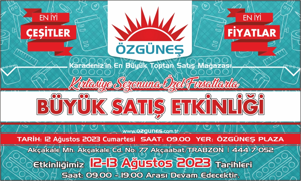 12 ve 13 Ağustos tarihlerinde Trabzon Akçakale'de bulunan Özgüneş Plaza'da gerçekleşecek satış etkinliğinde tüm müşterilerimizi ve iş ortaklarımızı aramızda görmekten mutluluk duyacağız.Ticaretiniz 39 yıllık tecrübeye emanet!