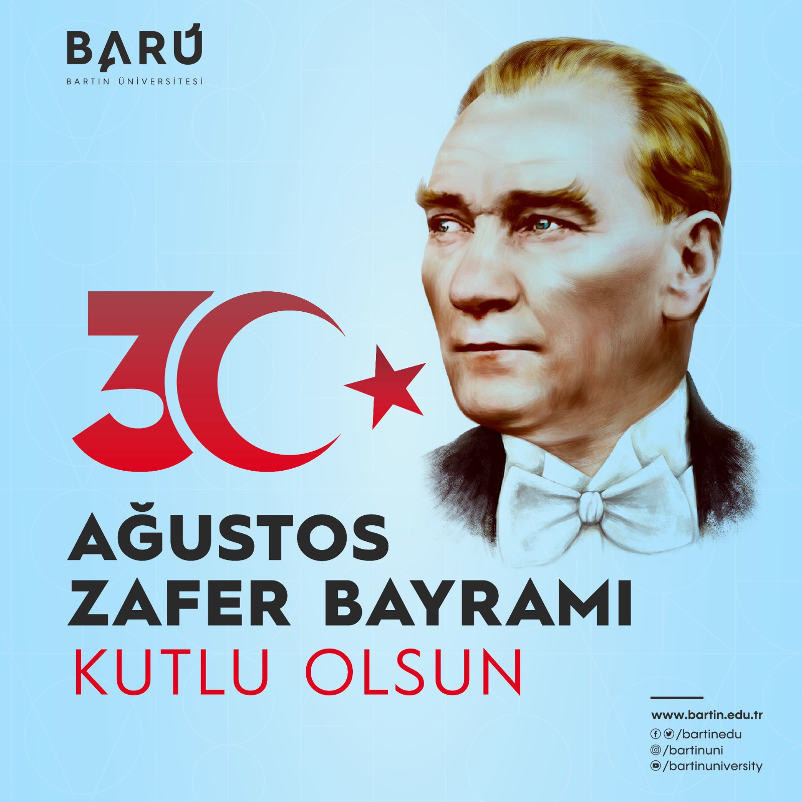 Ağustos ayındaki zaferlerimizin son halkasıyla millet olarak kararlılığımızı tüm dünyaya ilan ettiğimizi vurgulayan Bartın Üniversitesi (BARÜ) Rektörü Prof. Dr. Orhan Uzun, “30 Ağustos 1922, istiklal mücadelemizi zaferle taçlandırdığımız tarihtir. En zor şartlarda dahi mücadeleden vazgeçmeyen milletimiz, elde ettiği zaferle bu toprakların ezeli ve ebedi vatanımız olduğu tüm dünyaya bir kez daha ilan etmiştir” dedi.
