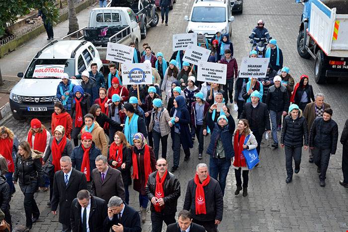 Akçaabat Toplum Sağlığı Merkezi, Kanserde farkındalık oluşturmak amacıyla ‘Sağlıklı Beslenme ve Hareketli Yaşam Yürüyüşü’ düzenledi. 4 Şubat Dünya Kanser günü etkinlikleri kapsamında Akçaabat Toplum Sağlığı Merkezi ev sahipliğinde düzenlenen farkındalık yürüyüşüne, Akçaabat Kaymakamı Soner Şenel, Trabzon Halk Sağlığı Müdürü Köksal Hamzaoğlu, İlçe Emniyet Müdürü Mehmet Hacıhasanoğlu, İlçe Toplum Sağlığı Merkezi Başkanı Dr. Alper Kalkışım, İlçe Yazı İşleri Müdürü Ali Baş, İlçe Gençlik ve Spor Müdür Engin Uzun, İlçe Nüfus  Müdürü Haydar Hotoman, İlçe Tarım Müdürü İbrahim Nezir, İlçe Sosyal Yardımlaşma ve Dayanışma Vakıfı Müdürü Yaşar Bayraktar, İlçe Müftülük Şube Müdürü Mehmet Cebeci, Akçaabat Gazeteciler Cemiyeti Başkanı Osman Başocak, Toplum Sağlığı Merkezi doktorları, öğrenciler ve vatandaşlar katıldı. Yürüyüş için katılımcılara kaşkol ve bere dağıtıldı. Ağanoğlu ilkokulu önünden başlayan yürüyüş Akçaabat Mesleki ve Teknik Anadolu Lisesi(eski Sağlık Meslek Lisesi) önünde son buldu.