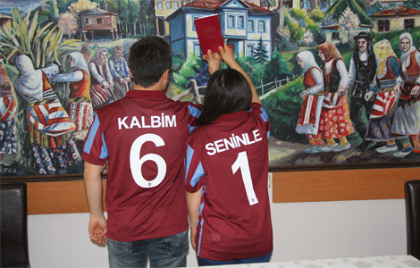 Bunlardan birisi de Fanatik Trabzonsporlu gençler Özlem Uçkun ile Savaş Şeras’ın nikâhı oldu. Genç çift Akçaabat Belediyesi evlendirme dairesine formalarıyla gelince bir hayli renkli görüntüler ortaya çıktı.