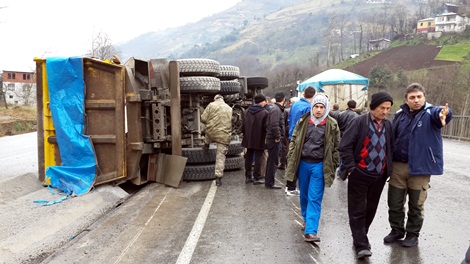 Düzköyden İstikametinden Akçaabat yönüne gitmekte olan A.Tütüncü yönetimindeki çakıl yüklü kamyon Alsancak köyünde kirazlık köyü köprü kavşağın'da yolun ıslak olması sebebiyle sürücünün direksiyon Hakimiyetini kaybetmesi sonucu devrildi.