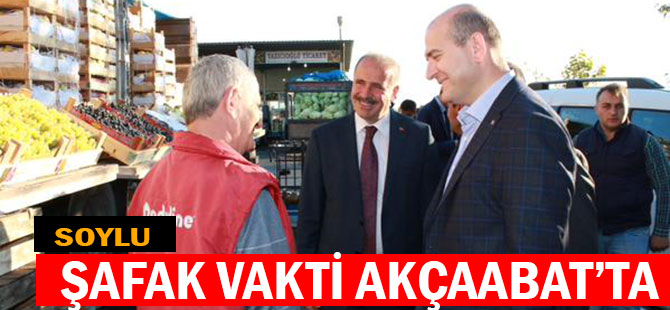 Soylu,  seçim çalışmalarına sabahın ilk ışıklarıyla Akçabata'ta başladı. Akçaabat Trabzon, Söğütlü, ve Mersin Minibüsçüler 1 Nolu Motorlu Taşıyıcılar Kooeratifini ziyaret etti.  Daha sonra ise sabah namazını Rahman Camiinde kıldı, ardından ise  Kavaklı Mahallesi'nde vatandaşlarla bir araya gelen Soylu, Akçaabat hal esnafını ziyaret ederek bol, bereketli kazançlar dileyerek esnafın sorunları ve taleplerini dinledi. Soylu, yapmış olduğu konuşmada 1 Kasım'da milletin çok önemli bir karar vereceğini ifade eden Soylu, “Milletin vereceği karar, Türkiye’nin istikbaline, huzuruna, istikrarına ve güveninedir. Milletimizin vereceği karar yeni, büyük, demokratik Türkiye’nin yoluna 2023, 2053 ve 2071′de devam etmesi konusundaki iradesini ortaya koymaktır” diye konuştu. Soylu, son 4 ayda Türkiye’nin sesini kısmak, gücünü azaltmak ve Türkiye’nin birinci sıçramasından sonra ikinci sıçramasını engellemek için terör örgütünün bataklığına çekmek için gösterilen çabayı gördüklerini vurgulayarak, şöyle devam etti: “13 yıldır size yanlış yapmadık. Sizinle iyi, huzurlu, güçlü bir Türkiye’yi buluşturmak istedik. 13 yıldır, Cumhuriyetimizin kuruluşunda bu ülkenin iki temel prensibi olan ‘tam bağımsızlık ve egemenlik kayıtsız şartsız milletindir’ lafsını en önemli noktaya getiren anlayışı ortaya koyduk. Size kötü bir ülke teslim etmiyoruz. Size 2 bin dolarlık Türkiye değil, 10 bin dolara ulaşan Türkiye bırakıyoruz. Size medeniyetinden kopuk Türkiye bırakmıyoruz. Medeniyetiyle bütünleşmiş Türkiye bırakıyoruz. Size IMF’nin boyunduruğu altında Türkiye bırakmıyoruz. Size, Merkez Bankası’nda 130 milyar parası olan Türkiye bırakıyoruz.” Millete, kumpas kuranlara karşı teslim olan Türkiye bırakmadıklarına dikkati çeken Soylu, konuşmasını şu sözlerle sürdürdü: “Allah’a şükürler olsun ki vesayetin kökünü de darbelerin kökünü de kazıyan Türkiye bırakıyoruz. Size herkesin kendini ifade edebildiği inancı, mezhebi, cinsiyeti şeklinde ayrıştırılmadığı, ötekileştirilmediği, herkesin insanlık onurunu sonuna kadar yakaladığı Türkiye bırakıyoruz. Size eksik bir Türkiye bırakmıyoruz. Size güçlü, kuvvetli, özgür ve hür Türkiye, dünyanın ilk 10 büyük devletinden birisi olmaya aday Türkiye bırakıyoruz.” “Biz bu ülkenin içerisinde kimseye ameliyat yaptırmayız” Soylu, kimsenin endişe etmemesi gerektiğine işaret ederek, “Biz bu ülkenin içerisinde kimseye ameliyat yaptırmayız. Türkiye’yi kendi iç meseleleri ile zenginliklerini dezavantaj olarak sunmak isteyenler, bugün PKK terör örgütünü ve terörü Türkiye’ye musallat etmeye çalışıyorlar. Bu meseleyi öyle bir çözeceğiz ki PKK’nın başını yılanın başını ezer gibi ezeceğiz. Herkes şahit olsun ki Türkiye’de PKK’nın adı bile anılmayacak” dedi. 1 Kasım seçimlerinin sadece iktidarı belirleyecek seçim olmadığını dile getiren Soylu, “1 Kasım seçimleri ülkemizin geleceğini, milletimizin ve Türkiye’nin selametini, aydınlık yarınlarını, insanların huzur ve rahat içinde yaşayabildiğini, herkesin iş ve aşla buluşabildiği ve herkesin yarınlardan endişesi olmayan Türkiye’yi kucaklayabildiği bir günün anahtarıdır. Bu anahtar sizin elinizdedir. Ülkemizin geleceğinin anahtarı, milli iradenin elindedir. İnşallah 1 Kasım’da, Türkiye’nin 13 yılda attığı adımların birini daha 2023′e kadar birlikte gerçekleştireceğiz” değerlendirmesinde bulundu. Soylu, Türkiye’nin gücünü kimsenin hafife almaması gerektiğini belirterek, “Türkiye’yi kimse sınamasın. Buradan bütün dünyaya sesleniyoruz, burada bizim borumuz öter, başkasının ötmez. Bizi 1990′lı yılların Türkiye’si ile karıştırmasınlar” ifadelerini kullandı. Soylu, daha sonra ise Akçaabat Kültür Park, Saray restorantta Sivil Toplum başkanları  ve muhtarlarla bir araya geldi. Soylu'nun Akçaabat programına AK Parti Trabzon Milletvekili adayı Adnan Günnar, ilçe başkanı Emre Akgün de katıldı.