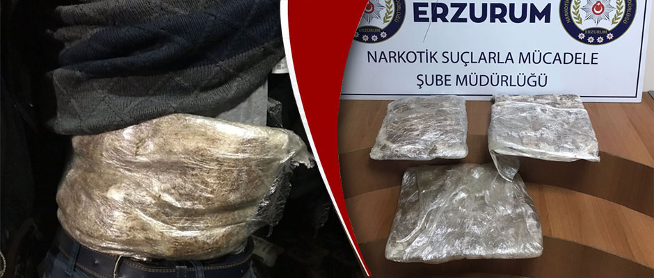 Erzurum'da polisin dikkati sonucu bellerine sarılı 3 kilo 748 gram uyuşturucuyla yakalanan biri kadın 2 kişi tutuklandı. İl Emniyet Müdürlüğüne bağlı Narkotik Suçlarla Mücadele Şubesi ekipleri, uyuşturucu sevkiyatı ve ticaretinin önlenmesine yönelik çalışmalarına devam ediyor. Ekipler, bu çerçevede Aziziye ilçesindeki kontrol noktasında bir yolcu otobüsünü durdurdu. Araçta kimlik kontrolü gerçekleştiren ekipler, durumundan şüphelendikleri B.D. adlı kadın ile yanında oturan M.D'nin üst aramasını yaptı. Aramada, şüphelilerin bellerine sarılı 3 kilo 748 gram esrar ele geçirildi. Uyuşturucuyu Diyarbakır'dan alarak Trabzon'a götürdükleri tespit edilen şüpheliler, emniyetteki işlemlerinin ardından sevk edildikleri mahkemece "Uyuşturucu madde ticareti yapmak veya nakletmek" suçundan tutuklandı.