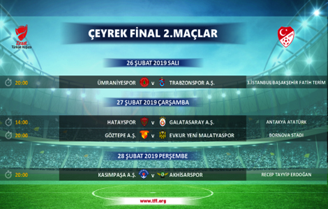Ziraat Türkiye Kupası Çeyrek Final'in 26, 27 ve 28 Şubat tarihlerinde oynanacak rövanş karşılaşmalarının programı belli oldu.