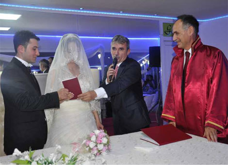 Takdim etmek üzere gelinin babası Bektaşoğlu’na evlilik cüzdanını veren Türkmen, “Ben karar veremedim kime vereceğimi. Belki babası torpil geçerek, evlilik cüzdanını kendi kızına teslim eder” diye latife yapmaktan da geri durmadı.