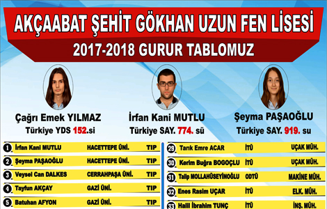Akçaabat Şehit Gökhan Uzun Fen Lisesi Akçaabat’ımıza büyük bir gurur yaşatarak Üniversite yerleştirmelerinde Yabancı dilde Türkiye 152. Sayısalda Türkiye 774. ve Türkiye 919. Derecelerinin yanı sıra; 28 TIP, 16 Mimarlık-Mühendislik, 6 Diş Hekimliği- Eczacılık ve Fizik Tedavi bölümlerine öğrenci kazandırmıştır.