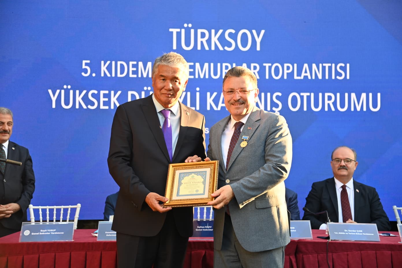 TÜRKSOY 5. Kıdemli Memurlar Toplantısı Yüksek Düzeyli Kapanış Oturumu’na katılan Trabzon Büyükşehir Belediye Başkanı Ahmet Metin Genç’e, destek ve katkılarından dolayı altın onur nişanı ve plaket takdim edildi.