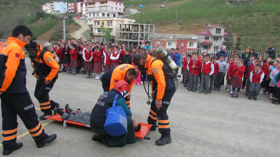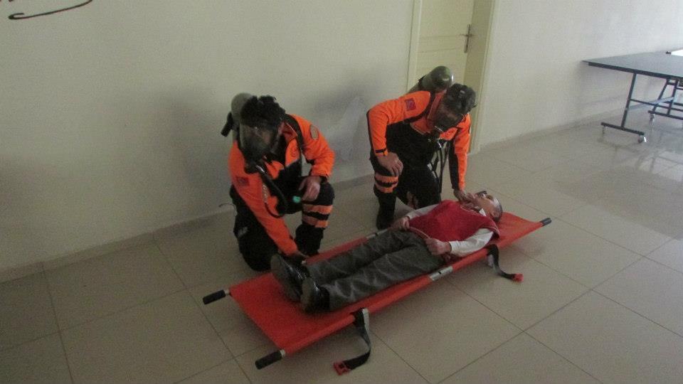 Daha sonra sembolik olarak okul binasında mahsur kalan yaralı bir öğrenciyi sedye ile okulun ikinci katından indiren ekipler, yine okulun üçüncü katından aşağıya da sarkıttıkları iplerle mahsur kalanların nasıl kurtarılacağını örneklerle gösterdi.