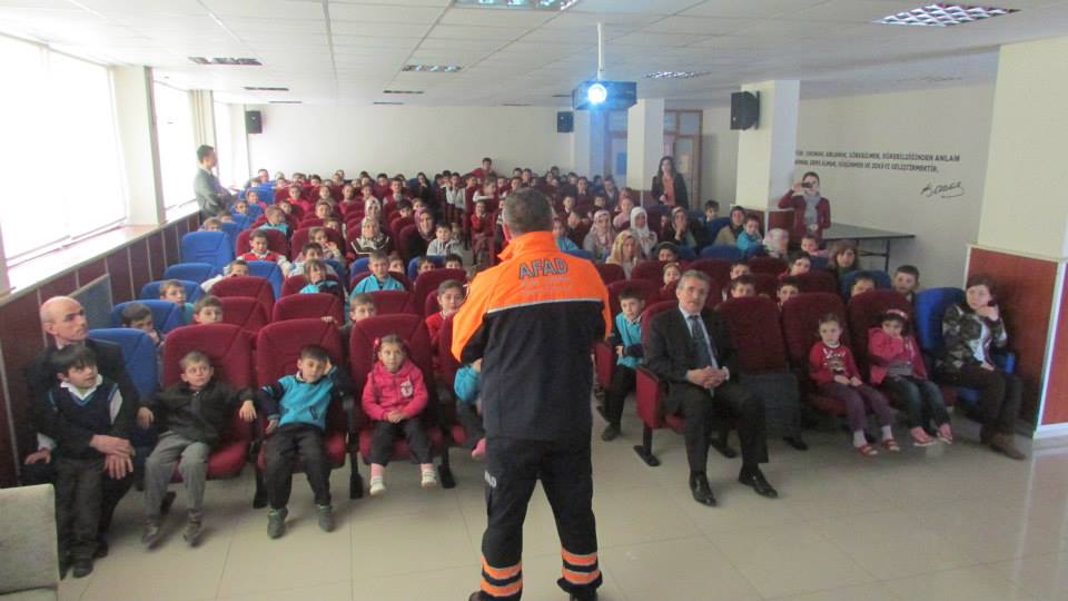 Okulun çok amaçlı salonunda gerçekleştirilen eğitim çalışmasının ardından teorik olarak öğretilenlerin pratiğini de yapmaya başlayan ekipler ilk olarak okulun sivil savunma sirenlerini çalarak öğrencilerin tahliyesini sağladılar.