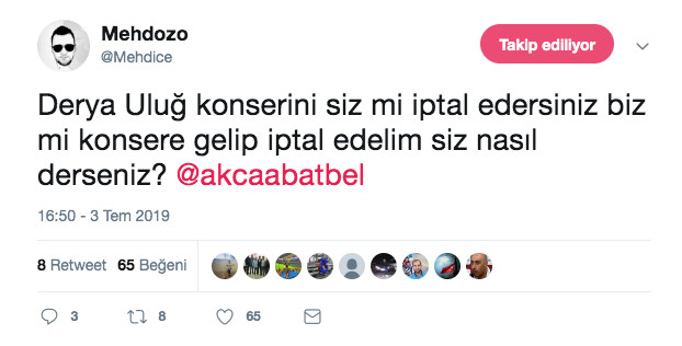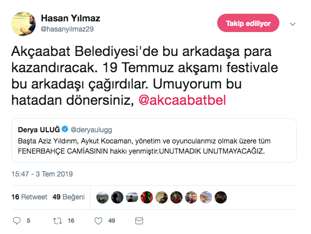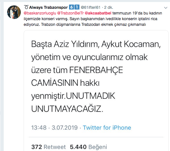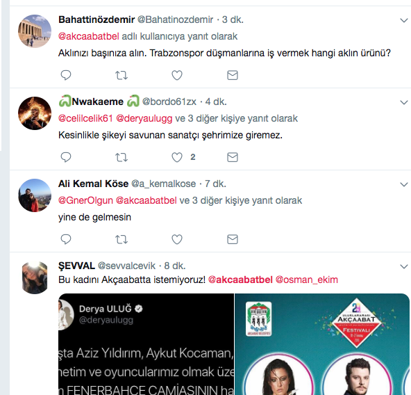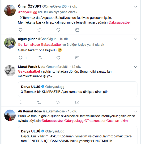 19 Temmuz’da Trabzon’un Akçaabat İlçesinde bir konser verecek olan Uluğ’a bu sözler sonrası Trabzonsporlu taraftarlardan adeta tepki yağdı. Bu yıl 29.’su düzenlenecek Akçaabat Festivalinde sahneye çıkacak Uluğ’u şehirde istemediklerini ifade eden taraftarlar, bu noktada Akçaabat Belediyesine de çağrıda bulundu. Taraftarlar, Derya Uluğ’un Akçaabat’ta düzenleyeceği konserin iptalini istedikleri görüldü. Akçaabat Belediyesinin ortaya çıkan bu durumdan sonra nasıl bir karar vereceği ise merak konusu..