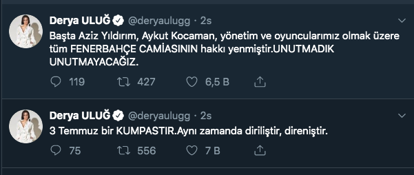 Pop müzik sanatçısı Derya Uluğ’a 3 Temmuz şike süreci ile ilgili sosyal medya hesabından yaptığı paylaşım bordo-mavili taraftarlardan tepki çekti. Kendisine ait sosyal medya hesabından her daim Fenerbahçeli olduğunu paylaşan Derya Uluğ, 3 Temmuz şike süreci ile ilgili, ilk olarak “ 3 Temmuz bir kumpastır. Aynı zamanda diriliştir, direniştir” şeklinde mesaj paylaşırken ardından "Başta Aziz Yıldırım, Aykut Kocaman, yönetim ve oyuncularımız olmak üzere tüm Fenerbahçe camiasının hakkı yenmiştir. Unutmadık unutmayacağız.” ifadelerini kullandı.