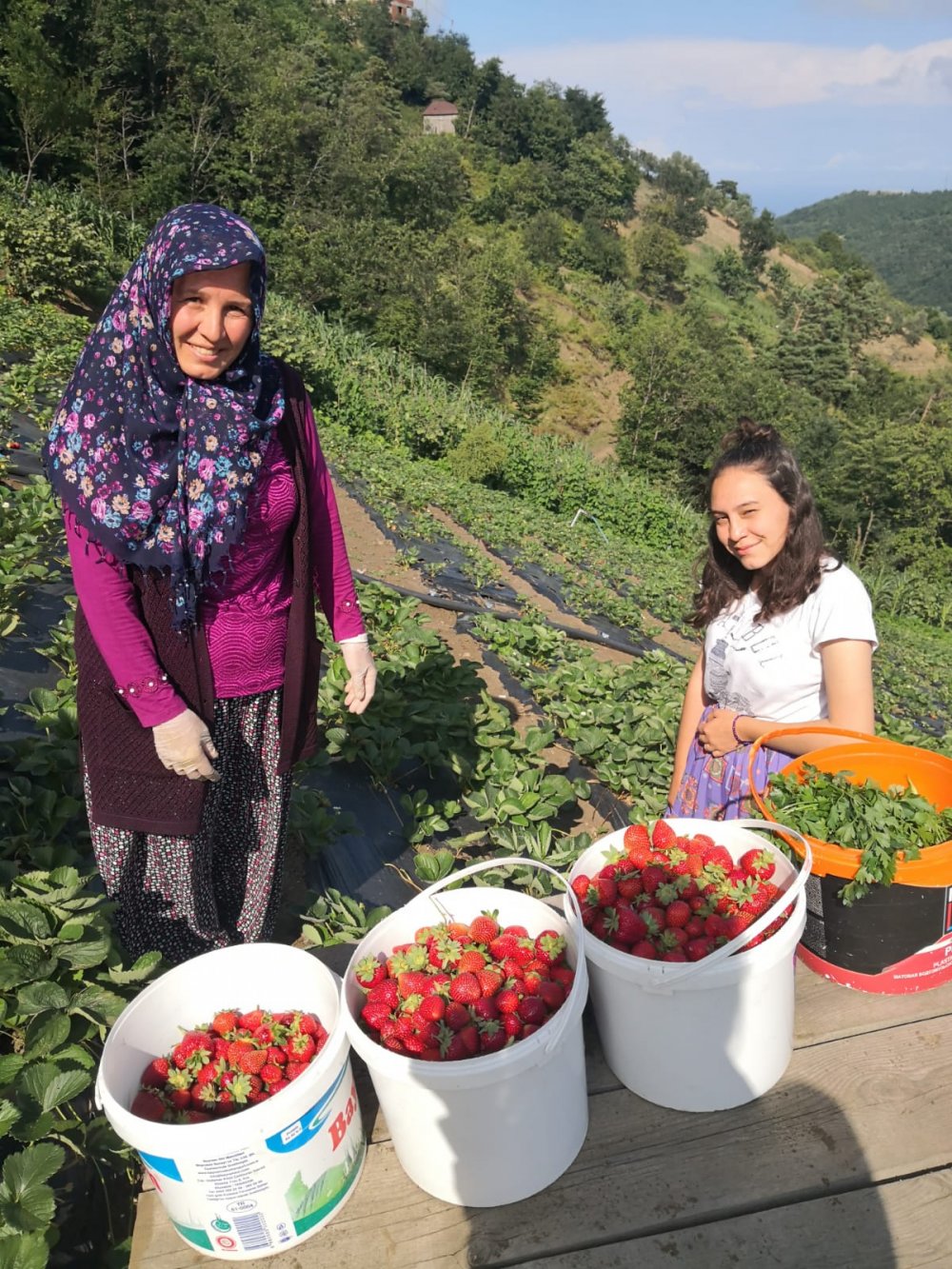 Nisan ayından itibaren çilek hasadı yapıyoruz. Çilek siparişlerine yetişemiyoruz. Aldığımız eğitimler sonucu çileğin, sadece yaz aylarında değil yılın her ayı ürün verebileceğini öğrendik. Modern damlama sulama sistemi kurulu olan bahçede malçlama sitemi ile çilek dikimini gerçekleştirdik. Çok zor arazi koşullarına rağmen burada çilek üretimini başarılı bir şekilde sürdürüyoruz. Arazi yapısının zor olduğundan dolayı taşımacılıkta , yöremizde çay ve fındık taşımakta kullanılan teleferik sistemini kurduk. Çilekleri teleferik yardımıyla evimizin kapısına kadar taşıyoruz. Bizim için kolaylık oluyor. 3 dönümden yılda 9-10 ton civarı ürün alıyoruz. Bu sene fiyatlar ve piyasamız çok iyi, kilosunu 15 TL den satışa sunduk. Ürünlerimizi, aracı olmadan direkt satıyoruz. Pastane, manavın dışında özellikle müşterilerimiz, bizi arıyorlar, ürünleri bahçede görmek istiyorlar, çilekleri bahçeden kendileri toplayıp alıyorlar, biz de memnun oluyoruz."